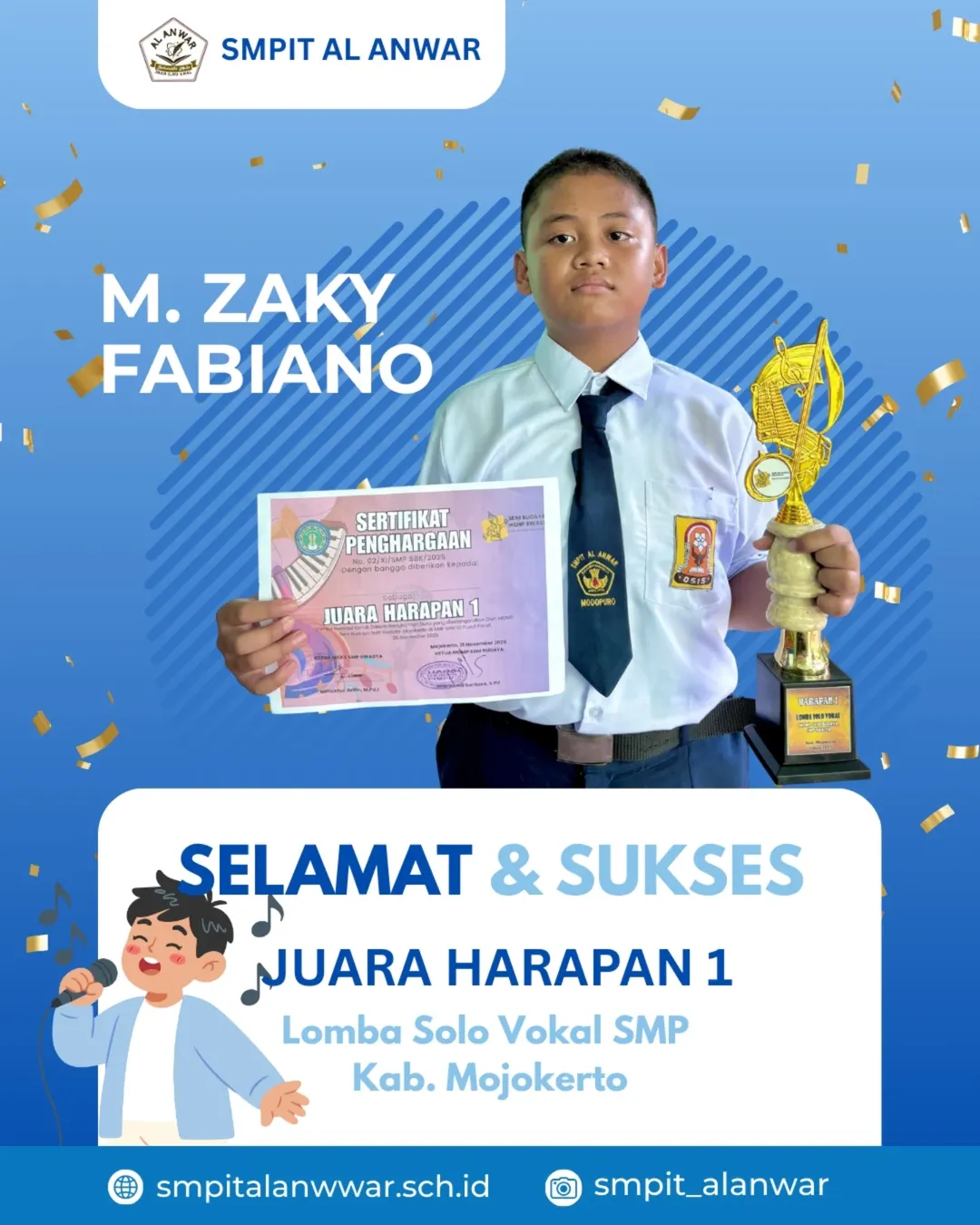 Selamat buat M. Zaky Fabiano yang baru saja menyabet piala Juara Harapan 1 di kompetisi Solo Vokal se-Kabupaten Mojokerto! Keren banget penampilannya! π₯ Semoga piala ini jadi penyemangat buat Fano untuk terus bernyanyi dan berkarya. Good job, Fano!π