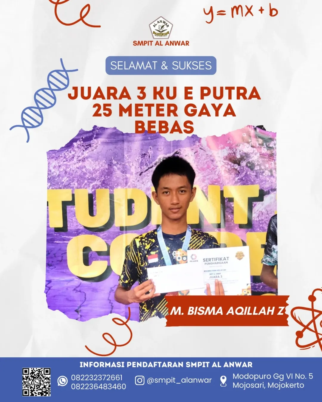 Selamat kepada Ananda M. Bisma Aqillah Z yang telah berhasil meraih Juara 3 KU E Putra 25 Meter Gaya Bebas "Student Swimming Competition"!ππ» Kerja keras dan latihanmu membuahkan hasil. Teruslah berjuang untuk menjadi yang terbaik di bidang olahraga!πͺ #SMPITAlAnwar #Renang #Juara3 #GayaBebas #Olahraga